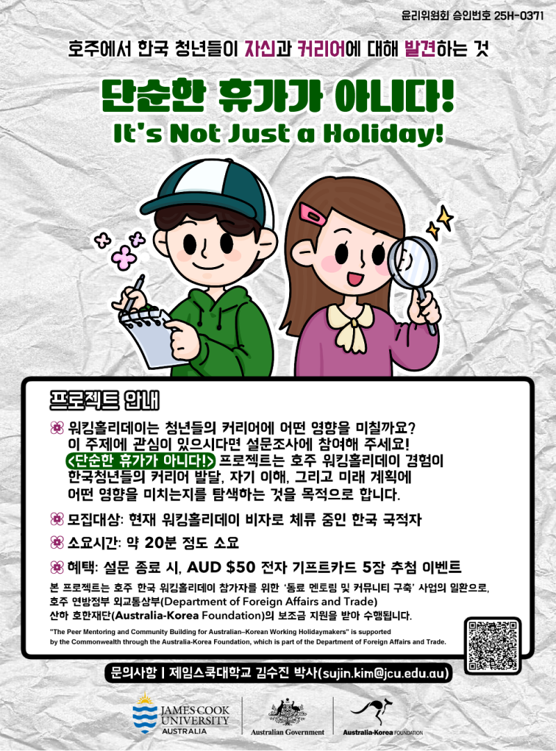 제임스쿡대학교에서 호한재단의 자금 지원을 받아 호주 워홀 청년들을 대상으로 프로젝트를 진행 중입니다.