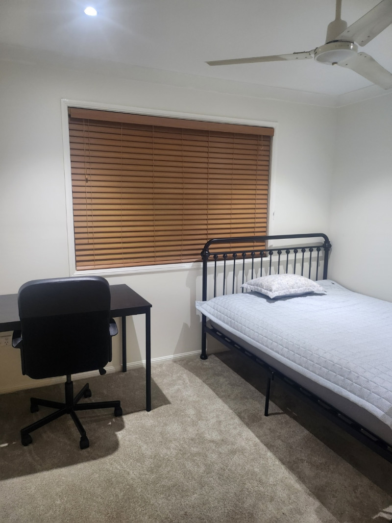 쉐어생분이 주로 쓰실 샤워실 + 독립 화장실, 냉장고 있고 방에는 더블 침대, 책상, 의자, 북박이 장, Ceiling Fan 등이 있습니다.