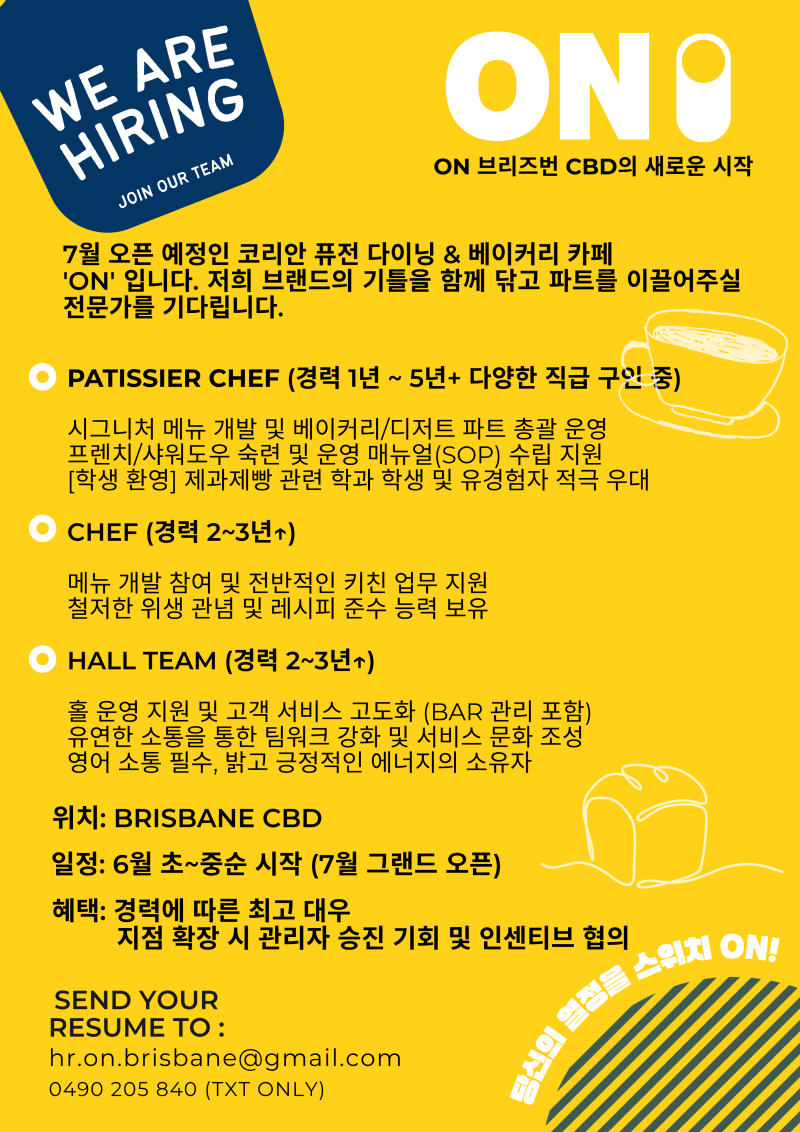 [카페] 브리즈번 CBD 신규 코리안 다이닝, 베이커리 카페 – 함께 성장할 각 파트 모십니다!