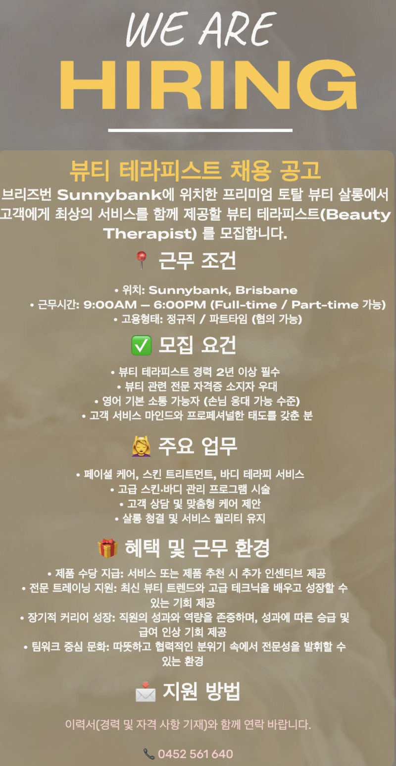 브리즈번 Sunnybank에 위치한 프리미엄 토탈 뷰티 살롱에서 고객에게 최상의 서비스를 함께 제공할 뷰티 테라피스트(Beauty Therapist) 를 모집합니다.