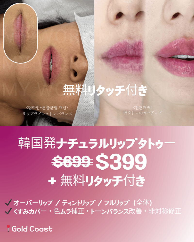私は韓国出身で、今とても人気のある 韓国スタイルのリップタトゥー を施術しています。