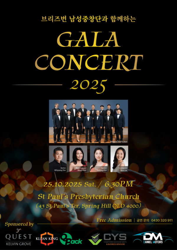 브리즈번 남성중창단 갈라 콘서트 2025년 10월 25일 토요일 오후 6:30분장소: 43 St Paul's Terrace, Spring Hill