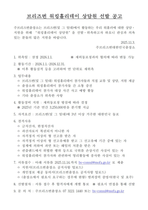 우리 브리즈번 출장소는 브리즈번 밴디츠 야구팀과 콜라보하여 Korea Night(야구 경기 행사)를 개최할 예정입니다. 평소 야구 관람을 즐기시는 분들께 좋은 기회이므로 관심있는 분들의 많은 참여 바랍니다. 1.…