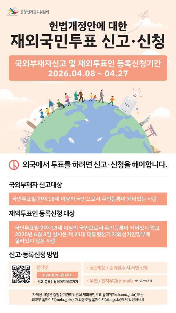 [ 헌법개정안에 대한 재외국민투표 국외부재자 신고 및 재외투표인 등록신청(4.8~4.27) 안내 ]국민투표의 국외부재자 신고 및 재외투표인 등록신청에 관하여 다음과 같이 안내하오니 외국에서 국민투표를 하려는 사람은 기간 내에 빠짐없이 신고 또는 신청을 하시어…