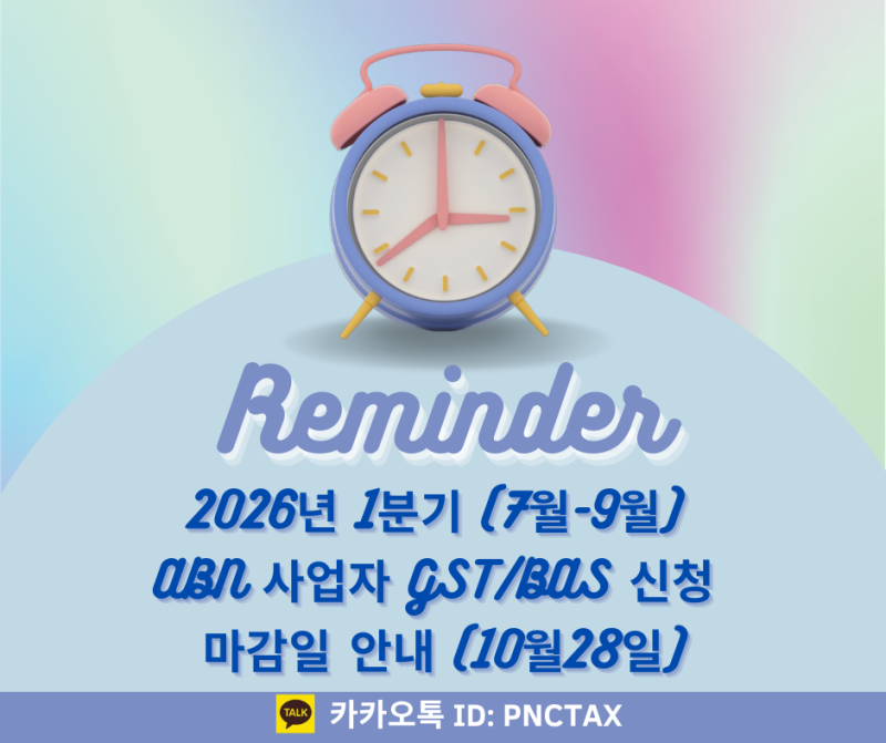 2026년 1분기 (7월 1일 ~ 9월 30일)에 대한 GST (Goods and Services Tax) 및 BAS (Business Activity Statement) 신청 마감일이 다가오고 있습니다. 자세한 내용은 하단의 저희 블로그 포스트 링크를 통해서 확인해주시기 바랍니다.